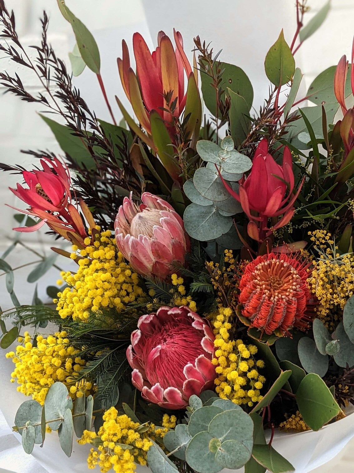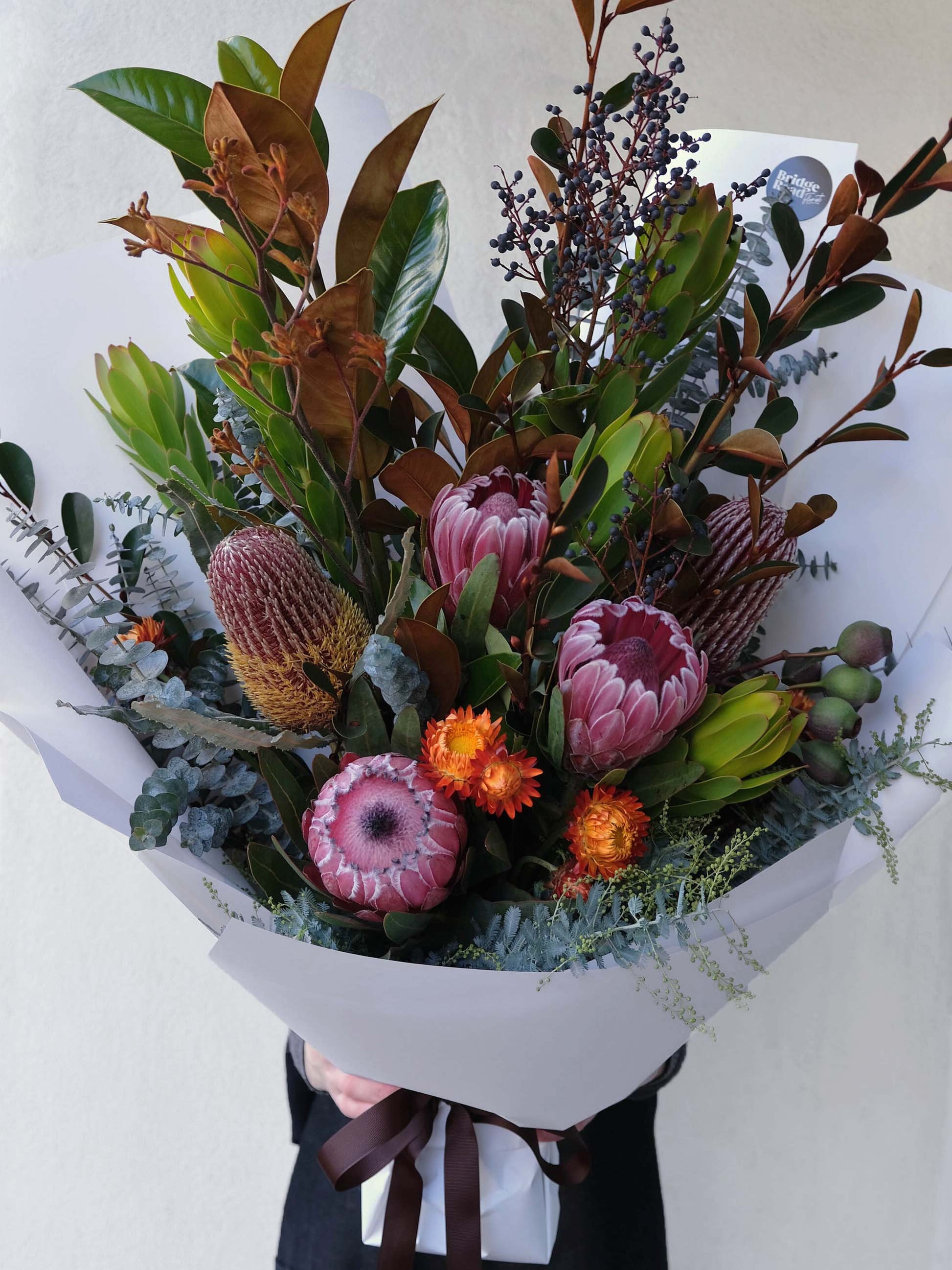 A wild and rustic bouquet of the freshest seasonal native flowers and foliage. Elegantly gift wrapped in paper with ribbon. The perfect gift for someone wild at heart, a lover of nature. Add vase at checkout for a native vase arrangement.